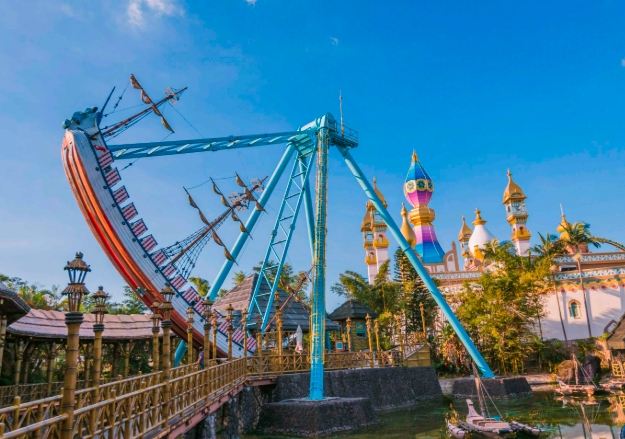 - 阿拉伯皇宮: 一千零一夜的夢幻感,「阿里巴巴與四十大盜」是室內設施,算是比較溫和有趣的,「蘇丹王大冒險」類似火山歷險但規模小一點。
