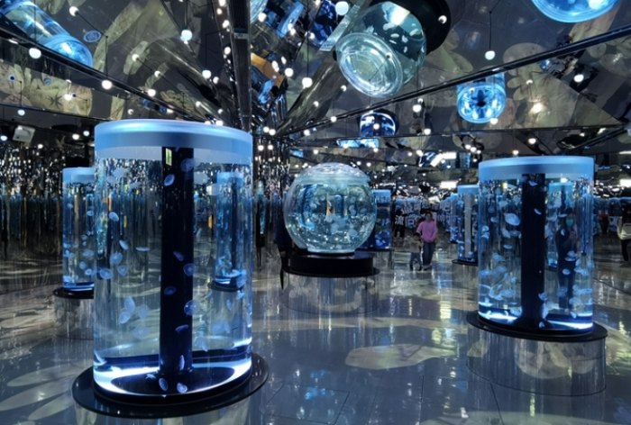 我個人超級愛的一個區域!好幾個大型圓柱形水缸,展示著不同種類的水母。在精心設計的燈光變換下(藍的、紫的、粉的...),水母優雅地一張一縮,緩緩漂浮,那個畫面真的非常療愈、非常夢幻!彷彿時間都慢下來了。強烈推薦坐在這裡靜靜觀賞幾分鐘,放空一下。