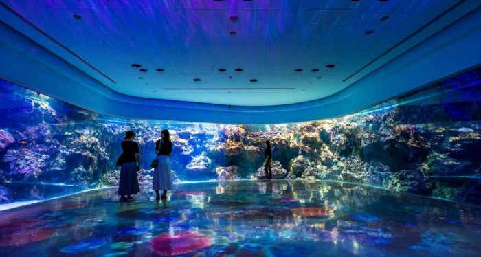 一個360度的環狀隧道!走進去就像被珊瑚礁包圍。各種色彩鮮豔的熱帶魚在你頭頂、身邊穿梭,還有海龜、小鯊魚偶爾遊過。光線透過水麵灑下來,波光粼粼,非常夢幻。這裡也是拍照聖地。